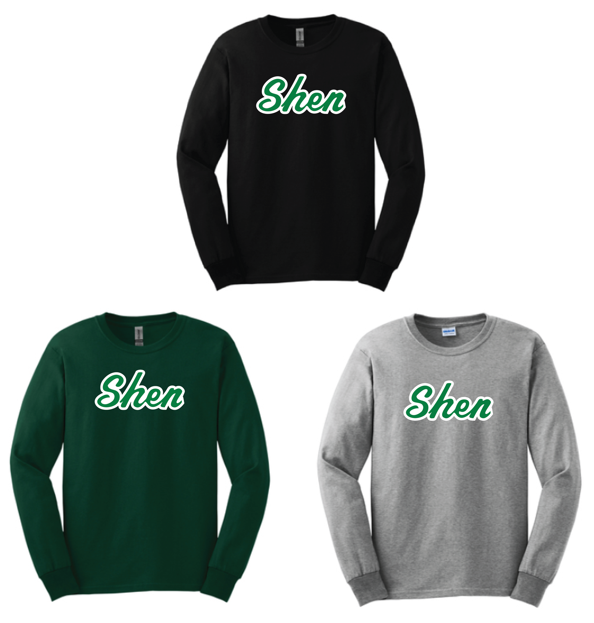 LONG SLEEVE COTTON TSHIRT - AVAILABLE IN YOUTH OR ADULT, CHOICE OF LOGO, and is available in Green, Black, or Grey.